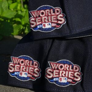The hats shown in the image are New Era New York Yankees 59FIFTY Fitted Caps, a popular, structured baseball hat style. The primary cap in focus is a navy blue colorway featuring a side patch that commemorates the 2009 World Series victory. Limited-edition, “exclusive” releases primarily available through specialty hat retailers or resale marketplaces.